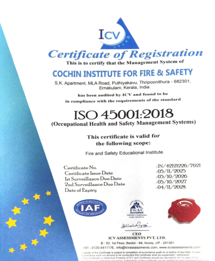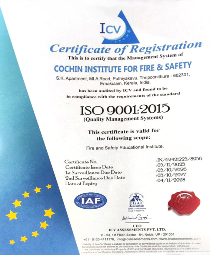Cochin Institute for Fire and Safety popularly known as CIFS is an ISO 9001-2015 , ISO 45001:2018 certified institute registered under Govt. of India (Ministry of Micro, Small and Medium Enterprises) with a vision to create safety awareness in every individual of the country and create safety professionals to secure the country.